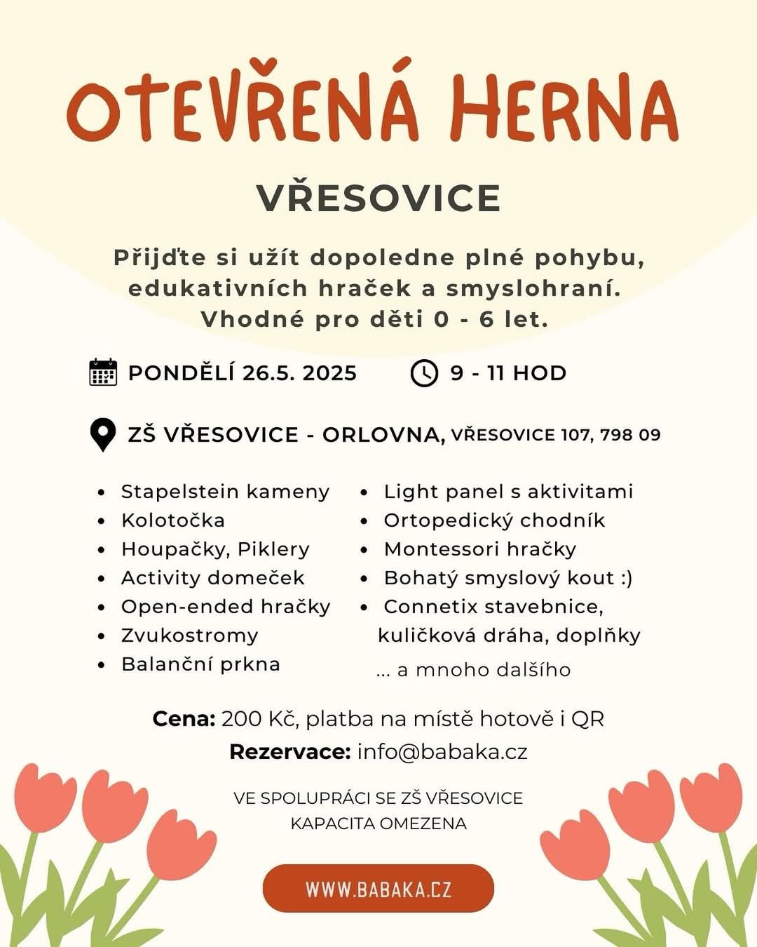 Jménem organizátorů vás zveme do OTEVŘENÉ HERNY ve Vřesovicích do prostor Orlovny. Přijďte si užít dopoledne plné pohybu, edukativních hraček a smyslohraní.